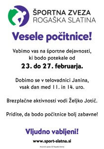 Vabimo vas na športne dejavnosti, ki bodo potekale od 23. do 27. februarja. Dobimo se v telovadnici Janina, vsak dan med 11. in 14. uro.